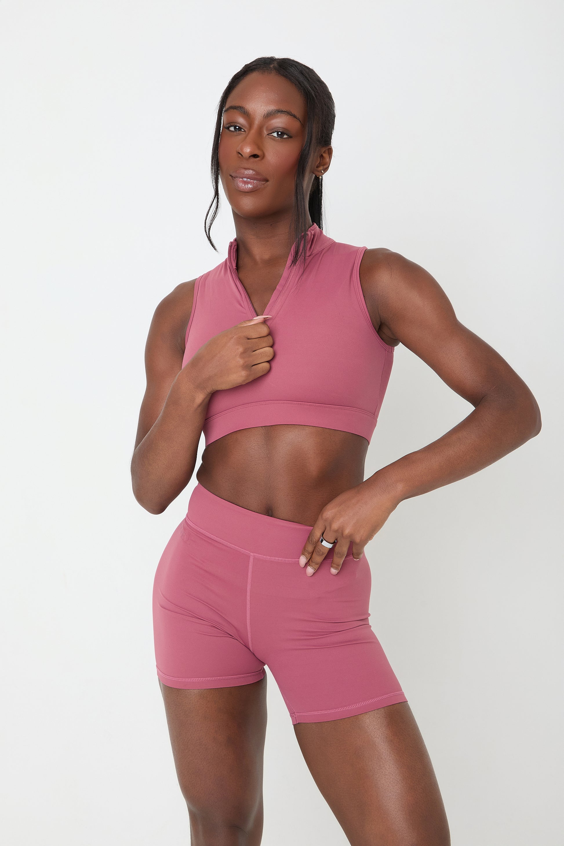 - High-neck quarter-zip crop top.